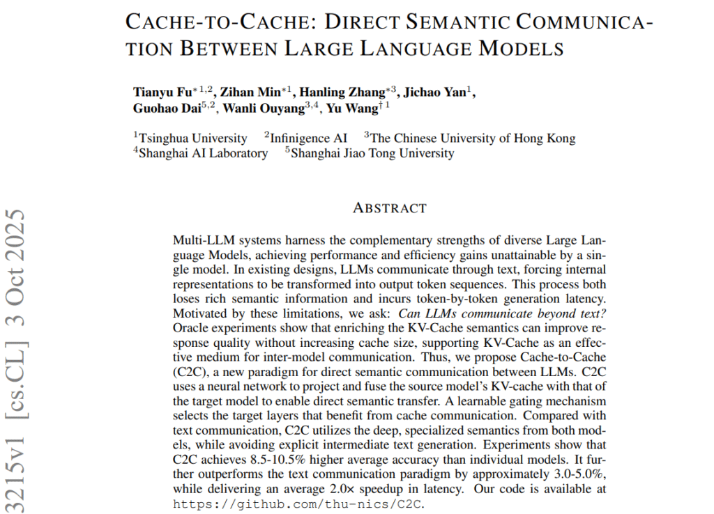این مقاله از تیم مشترک دانشگاههای Tsinghua, CUHK و Shanghai AI Lab معرفیکنندهٔ یک پارادایم جدید برای ارتباط مستقیم بین مدلهای زبانی بزرگ (LLMها) است. ایدهٔ اصلی آن، جایگزینی ارتباط متنی (Text-to-Text) با ارتباط در سطح حافظهٔ درونی مدل (KV-Cache) است تا تبادل معنا بهصورت مستقیم و بدون تولید توکنهای متنی انجام شود. روش پیشنهادی با نام Cache-to-Cache (C2C)، کیفیت پاسخ را تا 10٪ و سرعت را تا 2 برابر نسبت به روشهای متنی افزایش میدهد.
