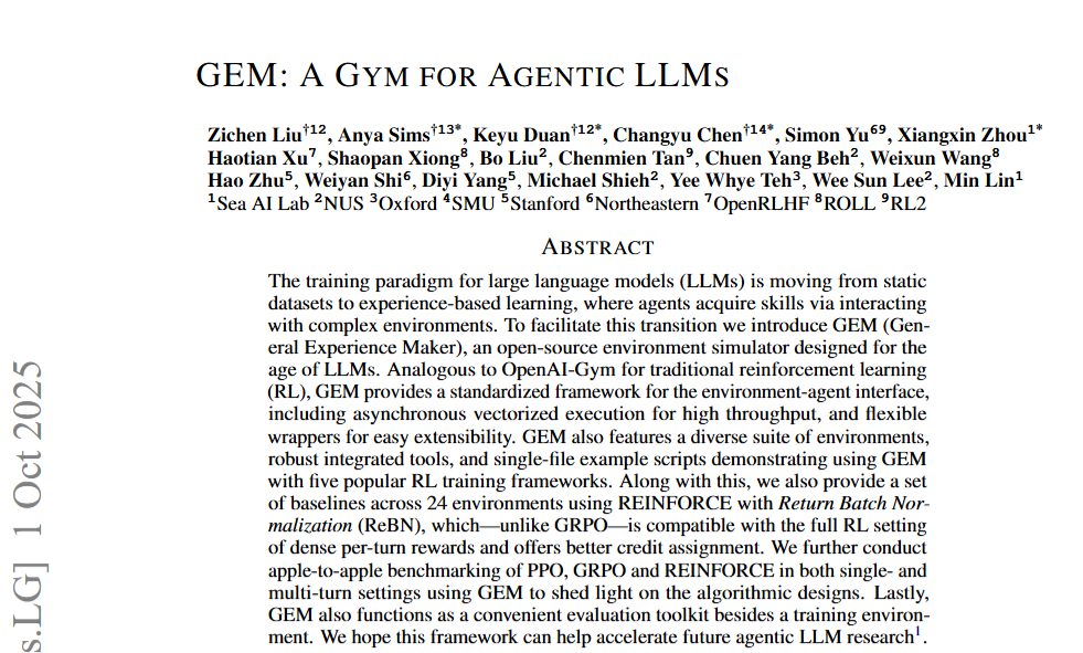 این مقاله با عنوان «GEM: A Gym for Agentic LLMs» به معرفی چارچوبی جدید برای آموزش و ارزیابی مدلهای زبانی عاملمحور از طریق یادگیری تقویتی (RL) میپردازد. در ادامه خلاصهی جامع آن تقدیم می شود: