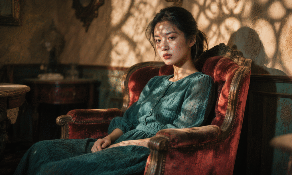 سوژه اصلی، زنی جوان آسیایی با چهرهای متفکر و رسا است که نگاهش کمی از دوربین دور است. او در حالتی آرام اما زیبا روی یک صندلی راحتی قدیمی و مزین نشسته است. روکش صندلی از مخمل قرمز تیره است و پارچه آن بافتهای پیچیده و ظریفی دارد و نشانههای کمی از فرسودگی در آن دیده میشود. او لباسی ساده و شیک به رنگ فیروزهای تیره پوشیده است که نور را به گونهای جذب میکند که بافت ریزبافت آن را نمایان میکند. پوست او نرم و مات است و نور به طرز ظریفی خطوط صورت و بازوهای او را ترسیم میکند.