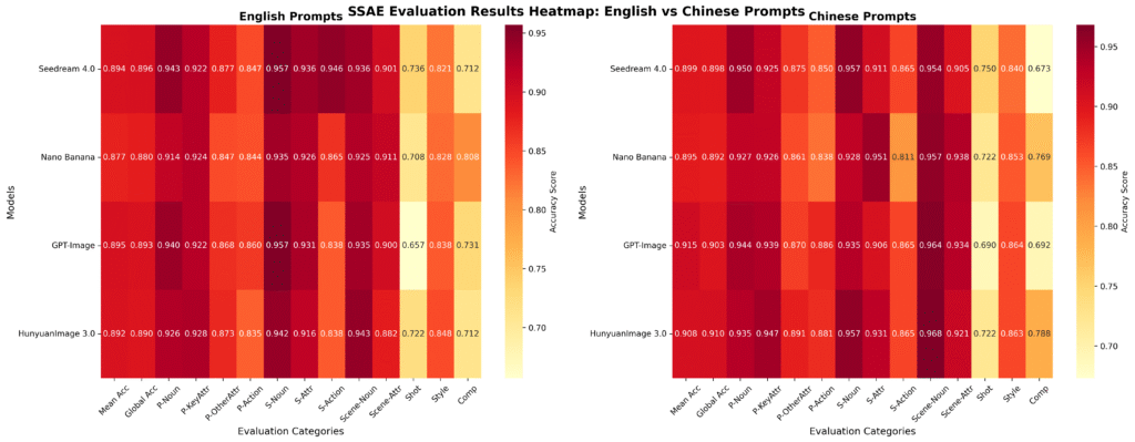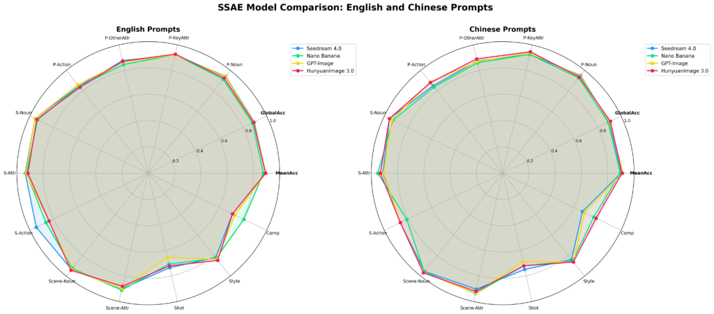 SSAE یا Structured Semantic Alignment Evaluation (ارزیابی همترازی معنایی ساختاریافته) یک معیار ارزیابی هوشمند برای همترازی تصویر-متن مبتنی بر مدلهای زبان بزرگ چندوجهی پیشرفته (MLLM) است. ما ۳۵۰۰ نکته کلیدی را در ۱۲ دسته استخراج کردیم، سپس از مدلهای زبان بزرگ چندوجهی برای ارزیابی خودکار و امتیازدهی با مقایسه تصاویر تولید شده با این نکات کلیدی بر اساس محتوای بصری تصاویر استفاده کردیم. میانگین دقت تصویر، میانگین امتیاز تصویر را در تمام نقاط کلیدی نشان میدهد، در حالی که دقت کلی مستقیماً میانگین امتیاز را در تمام نقاط کلیدی محاسبه میکند.
