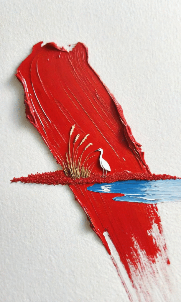 پرامپت:یک نقاشی رنگ روغن مینیمالیستی از بالا، که موضوع اصلی آن یک ضربه قلم موی قرمز تکی، مرکزی و مورب است. این ضربه قلم موی قرمز چشمگیر، که با تکنیک ایمپاستو اجرا شده، حس قوی از ضخامت فیزیکی و سهبعدی بودن را ایجاد میکند. این ضربه قلم موی قرمز چشمگیر، که از نزدیک گوشه بالا سمت چپ تا نزدیک گوشه پایین سمت راست امتداد یافته و یک خط مورب پویا تشکیل میدهد. ردهای به جا مانده از خراشیدن کاردک پالت و کشیدن قلم مو به وضوح روی سطح قابل مشاهده است، لایه رنگ در لبهها نازکتر و در مرکز ضخیم تر است و یک موج نامنظم ایجاد میکند. در بالای این رنگ قرمز سهبعدی، یک منظره مینیاتوری ظریف به طرز ماهرانهای ساخته شده است. در هسته آن، یک ساحل قرمز شبیهسازی شده، که با ظرافت با رنگ قرمز تیره نقطهگذاری شده است، تضاد غنی با قرمز پر جنب و جوش پایه زیرین ایجاد میکند. در مجاورت این “ساحل قرمز” دریاچه کوچکی قرار دارد که از یک لایه صاف و براق آبی و سفید تشکیل شده و به آن بافتی آرام میبخشد. در لبه دریاچه، یک توده کوچک از نیها با چند خط باریک و عمودی که با رنگهای زرد کمرنگ و قهوهای مشخص شدهاند، نشان داده شده است. یک حواصیل کوچک در کنار نیزارها ایستاده است، فرم آن با یک ایمپاستوی سفید خالص کوچک تعریف میشود، منقار نوکتیز آن تنها با کمی رنگ سیاه تصفیهشده برجسته میشود. پسزمینهی ترکیببندی عمدتاً خالی است، یک پایه کاغذ سفید با بافت ظریف. این رویکرد مینیمالیستی به طور چشمگیری بر ضربات قلممو قرمز مرکزی و منظرهی مینیاتوری بالا تأکید میکند. نور به آرامی از کنار به پایین میتابید و سایههای ظریف و تیزی را در لایههای ضخیم رنگ ایجاد میکرد و سهبُعدی بودن و کیفیت نقاشانهی نقاشی را بیشتر افزایش میداد. تصویر حاصل، سبک مینیمالیستی مدرنی را به نمایش میگذارد که شامل تکنیکهای ایمپاستوی ضخیم است.