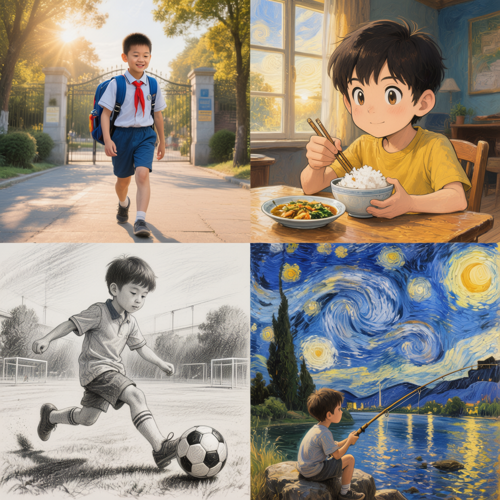 پرامپت:این تصویر که از یک شبکه دو ردیفی و دو ستونی تشکیل شده است، شامل چهار صحنه جداگانه است که هر کدام یک پسر جوان (شیائو مینگ) را در حال انجام یک فعالیت روزانه متفاوت با سبک هنری متفاوت نشان میدهد. صحنه اول، در گوشه بالا سمت چپ، به سبک عکاسی فوق واقعگرایانه ارائه شده است. سوژه، پسری از آسیای شرقی، تقریباً هشت ساله، با لباس فرم مدرسه ابتدایی مرتب با یک پیراهن آستین کوتاه سفید، شلوارک آبی و یک پارچه قرمز که دور گردنش بسته شده است. او یک کوله پشتی آبی حمل میکند و در حال رفتن به مدرسه است. او در پیشزمینه، کمی به سمت راست، لبخند میزند و با سرعت راه میرود. صحنه در اوایل صبح گرفته شده است، با نور ملایم خورشید که از بالا سمت چپ فیلتر میشود و سایههای نرم و واضحی بر پیادهرو میاندازد. در پسزمینه، یک خیابان درختکاری شده و دروازههای آهنی فرفورژه مدرسه که به طور مبهمی قابل مشاهده هستند، یک فضای آرام صبحگاهی ایجاد میکنند. تصویر به طرز چشمگیری جزئیات دارد، درخشش موهای پسر، چین و چروک لباسهایش و بوم کوله پشتیاش به وضوح قابل مشاهده است و کیفیت یک عکس حرفهای را مجسم میکند. صحنه دوم، در گوشه بالا سمت راست، به سبک انیمههای سلشید (cel shade) ژاپنی ارائه شده است. در این نقاشی، پسر جوانی پشت میز ناهارخوری چوبی خانوادهاش نشسته و ناهار میخورد. شخصیت او شبیه انیمه است، با چشمانی بزرگ و درخشان و چهرهای تمیز. او یک تیشرت زرد ساده پوشیده و با چوب غذاخوری از کاسهای برنج برمیدارد. یک کاسه سوپ و دو بشقاب غذای خانگی روی میز قرار داده شده است. پسزمینه، فضای داخلی گرمی است، با پنجرهای روشن که آفتاب ظهر را فیلتر میکند و آسمانی آبی و ابرهای سفید در آن سوی آن. نقاشی پر جنب و جوش و اشباع شده است، با خطوط کلی شخصیتهای برجسته و مشخص و سایههای مسطح و بلوکی، به سبک انیمیشن کلاسیک سلشید. صحنه سوم، در گوشه پایین سمت چپ، به سبک طراحی مدادی ظریف ارائه شده است. این تصویر، پسر جوانی را نشان میدهد که بعد از ظهر در زمین بازی فوتبال بازی میکند. کل تصویر از سایههای مختلف گرافیت تشکیل شده است، بدون رنگهای دیگر. پسر بچه که پیراهن ورزشی آستین کوتاه و شلوارک پوشیده، به جلو خم شده و پای راستش آماده شوت کردن توپ فوتبال است و حرکاتش پر از حرکت است. پسزمینه یک زمین بازی خالی و یک دروازه در دوردست است که با خطوط ساده مشخص شده است. هنرمند از تکنیکهای هاشور متقاطع و لکهگذاری برای انتقال نور، سایه و حجم استفاده میکند. ضربات مداد به طور کامل سایههای روی توپ، خطوط عضلانی چهرهها و بافت خشن زمین را به تصویر میکشد. این نقاشی مدادی، روابط نور و سایه و کیفیت زیباییشناسی خطوط را برجسته میکند. صحنه چهارم، در گوشه پایین سمت راست، به سبک پست امپرسیونیست ونسان ون گوگ تفسیر شده است. این نقاشی، پسر جوانی را نشان میدهد که شب هنگام به تنهایی در کنار رودخانه ماهیگیری میکند. او روی صخرهای نشسته و یک چوب ماهیگیری ساده در دست دارد و چهرهاش در مقابل آبی عمیق آسمان شب کوچک به نظر میرسد. نقاط کانونی بصری نقاشی، آسمان و آب هستند. آسمان پر از سحابیهای چرخان و حلقهای است و ستارگان و ماه به صورت تودههای عظیم و درخشان به تصویر کشیده شدهاند. در این اثر از ایمپاستو (رنگ روغن غلیظ) با ضربات قلمموهای جسورانه و پرانرژی استفاده شده است. آبی پررنگ، زرد روشن و سفید در سراسر بوم در هم تنیدهاند و تأثیر بصری قدرتمندی ایجاد کردهاند. آب، نور و سایههای کج و معوج آسمان را منعکس میکند و صحنه را با احساسات شدید و زیبایی متلاطم که مشخصه آثار ون گوگ است، آغشته میکند. این نقاشی ادای احترامی عمیق به سبک ون گوگ است.