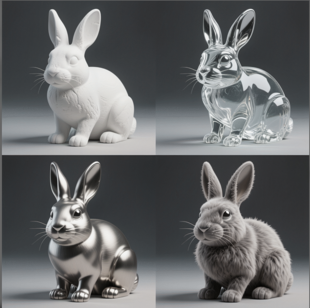 پرامپت:تصویر کلی، که در یک شبکه دو در دو چهارتایی چیده شده است، رندر یک خرگوش را با استفاده از چهار ماده مختلف نشان میدهد که پس از تجسم محصول، طراحی شدهاند. هر شبکه شامل یک مدل خرگوش یکسان در حالت نشسته، گوشهای ایستاده و رو به جلو است. همه شبکهها دارای یک پسزمینه خاکستری تیره خنثی و یکنواخت هستند، طرحی مینیمالیستی که برای به حداکثر رساندن بافتهای منحصر به فرد هر ماده طراحی شده است. در شبکه بالا سمت چپ، مدل خرگوش از گچ سفید مات ساخته شده است. سطح آن صاف، یکنواخت و غیر بازتابنده است. در نواحی فرورفته، مانند پایه گوشها و در محل اتصال اندامها، سایههای انسداد محیطی نرم اعمال شده است. این سایهزنی ظریف بر هندسه خالص مدل تأکید میکند و تصور یک مدل اولیه برای مطالعه هنری را ایجاد میکند. در شبکه بالا سمت راست، مدل خرگوش از شیشه شفاف و بیعیب و نقص ساخته شده است. این مدل انکسار واقعگرایانه و مبتنی بر فیزیک را به نمایش میگذارد و پسزمینهای را که از طریق بدن شفاف آن دیده میشود، به طور نامحسوسی تغییر میدهد. هایلایتهای آینهای واضح در امتداد منحنیهای بدنش جریان دارند، در حالی که بازتابهای ضعیف اما متمایزی از محیط اطراف روی سطح آن قابل مشاهده است و به آن کیفیتی ظریف و شکننده میبخشد. در پنل پایین سمت چپ، مدل خرگوش با تیتانیوم برس خورده ارائه شده است. سطح فلز بازتاب ناهمسانگرد قابل توجهی را نشان میدهد و یک درخشش فلزی سرد و خاکستری ایجاد میکند. تضاد چشمگیر بین هایلایتهای تیز و روشن و سایههای عمیق، فرم ناهموار و سهبعدی آن را به طور دقیق تعریف میکند و یادآور زیباییشناسی طراحی صنعتی است. در پنل پایین سمت راست، مدل خرگوش با خز خاکستری نرم و متراکم پوشیده شده است. هر مو به وضوح قابل مشاهده است و بافتی گرم و لمسی ایجاد میکند. نور در نوک خز میدرخشد و یک اثر هاله نرم ایجاد میکند، در حالی که سایههای درون خز عمیق و نرم به نظر میرسند و رندر بسیار واقعگرایانه خز را به نمایش میگذارند. نورپردازی نرم و یکنواخت استودیویی، کل چهار پنل را از جهات مختلف روشن میکند و تضمین میکند که هر جزئیات و ویژگی مواد بدون سایههای تند یا هایلایتهای برجسته به وضوح نمایش داده میشود. این تصویر که به سبک رندر سهبعدی بسیار واقعگرایانهای ارائه شده است، جوهره تجسم محصول را به طور کامل مجسم میکند.